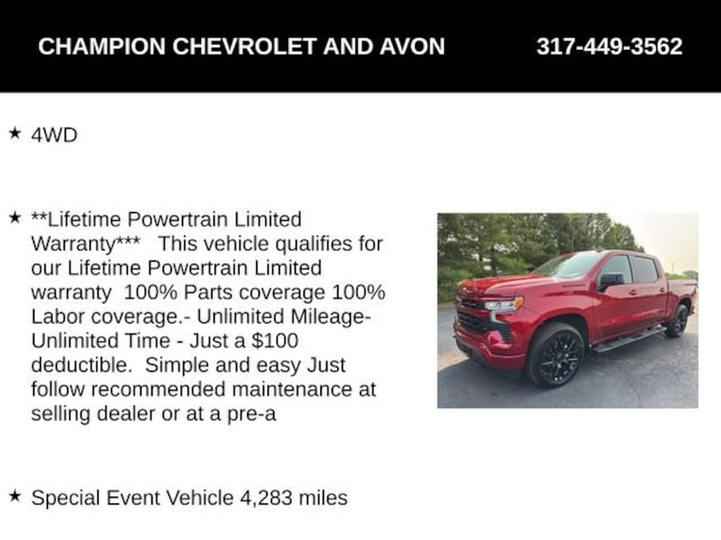 4WD, **Lifetime Powertrain Limited Warranty*** This vehicle qualifies for our Lifetime Powertrain Limited warranty 100% Parts coverage 100% Labor coverage.- Unlimited Mileage- Unlimited Time - Just a $100 deductible. Simple and easy Just follow recommended maintenance at selling dealer or at a pre-a, Special Event Vehicle 4,283 miles, 10-Speed Automatic, 4WD, Black Leather, 10-Way Power Driver Seat w/Lumbar, 12.3 Multicolor Reconfigurable Digital Display, 120-Volt Bed Mounted Power Outlet, 120-Volt Interior Power Outlet, 6-Speaker Audio System, All-Star Edition, Auto-Locking Rear Differential, Black Name Plates (LPO), Bluetooth® For Phone, Chevrolet Connected Access Capable, Chevytec Spray-On Black Bedliner, Color-Keyed Carpeting Floor Covering, Convenience Package, Convenience Package II, Dark Essentials Package (LPO), Deep-Tinted Glass, Dual Rear USB Ports (Charge Only), Dual-Zone Automatic Climate Control, Electric Rear-Window Defogger, Electrical Steering Column Lock, Electronic Cruise Control, EZ Lift Power Lock & Release Tailgate, Front Frame-Mounted Black Recovery Hooks, Front LED Fog Lamps, Front Rubberized Vinyl Floor Mats, HD Rear Vision Camera, Heated Driver & Front Outboard Passenger Seats, Heated Power-Adjustable Outside Mirrors, Heated Steering Wheel, High Capacity Suspension Package, High Gloss Black Mirror Caps, Hitch Guidance, Hitch Guidance w/Hitch View, In-Vehicle Trailering System App, Inside Rear-View Mirror w/Tilt, Integrated Trailer Brake Controller, Keyless Open & Start, Leather Package, Leather-Appointed Front Seat Trim, LED Cargo Area Lighting, OnStar & Chevrolet Connected Services Capable, Power Front Windows w/Driver Express Up/Down, Power Front Windows w/Passenger Express Down, Power Rear Windows w/Express Down, Power Sliding Rear Window w/Rear Defogger, Preferred Equipment Group 1SP, Premium Bose 7-Speaker Sound System, Protection Package, Rear 60/40 Folding Bench Seat (Folds Up), Rear Rubberized-Vinyl Floor Mats, Rear Wheelhouse Liners, Remote Vehicle Starter System, SiriusXM w/360L, Standard Tailgate, Steering Wheel Audio Controls, Theft Deterrent System (Unauthorized Entry), Trailering Package, Universal Home Remote, Up-Level Rear Seat w/Storage Package, Wi-Fi Hot Spot Capable, Wrapped Steering Wheel.