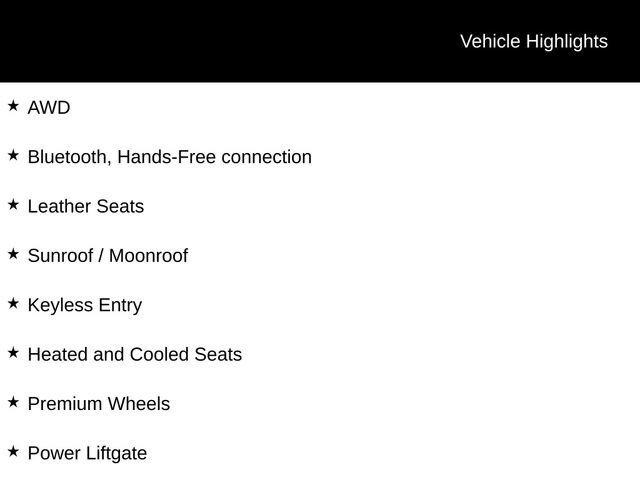 AWD, Bluetooth, Hands-Free connection, Leather Seats, Sunroof / Moonroof, Keyless Entry, Heated and Cooled Seats, Premium Wheels, Power Liftgate, AWD.