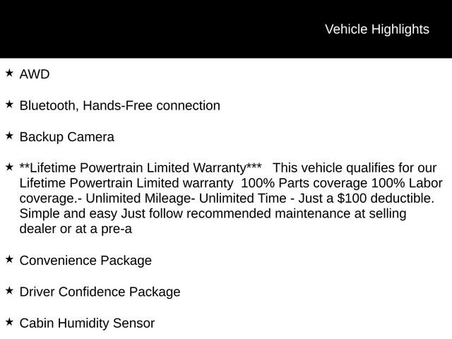 AWD, Bluetooth, Hands-Free connection, Backup Camera, **Lifetime Powertrain Limited Warranty*** This vehicle qualifies for our Lifetime Powertrain Limited warranty 100% Parts coverage 100% Labor coverage.- Unlimited Mileage- Unlimited Time - Just a $100 deductible. Simple and easy Just follow recommended maintenance at selling dealer or at a pre-a, 120-Volt Power Outlet, Cabin Humidity Sensor, Convenience Package, Driver Confidence Package, Hands Free Power Programmable Liftgate, Inside Rear-View Auto-Dimming Mirror, Rear Cross Traffic Alert, Rear Park Assist, Single-Zone Automatic Climate Control, Wireless Charging.