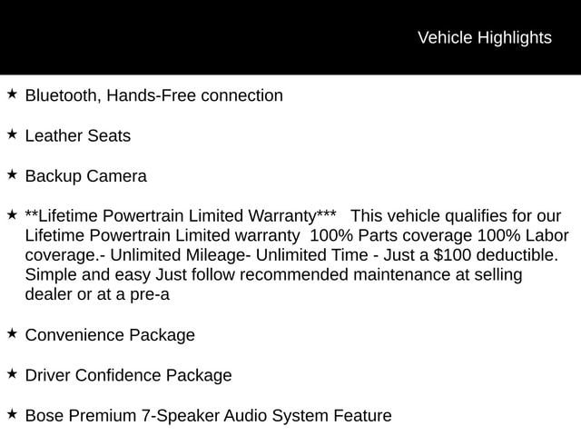 Bluetooth, Hands-Free connection, Leather Seats, Backup Camera, **Lifetime Powertrain Limited Warranty*** This vehicle qualifies for our Lifetime Powertrain Limited warranty 100% Parts coverage 100% Labor coverage.- Unlimited Mileage- Unlimited Time - Just a $100 deductible. Simple and easy Just follow recommended maintenance at selling dealer or at a pre-a, 120-Volt Power Outlet, Adaptive Cruise Control, Bose Premium 7-Speaker Audio System Feature, Cabin Humidity Sensor, Convenience Package, Driver Confidence Package, Hands Free Power Programmable Liftgate, Inside Rear-View Auto-Dimming Mirror, Rear Cross Traffic Alert, Rear Park Assist, Single-Zone Automatic Climate Control, Wireless Charging.