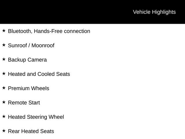 Bluetooth, Hands-Free connection, Sunroof / Moonroof, Backup Camera, Heated and Cooled Seats, Premium Wheels, Remote Start, Heated Steering Wheel, Rear Heated Seats, AWD.