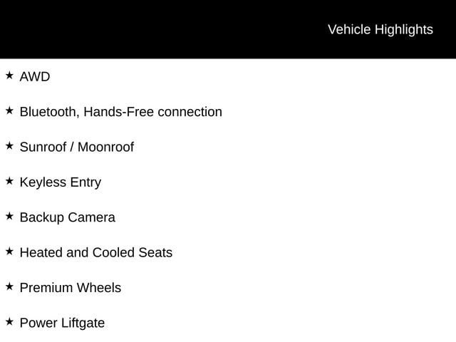 AWD, Bluetooth, Hands-Free connection, Sunroof / Moonroof, Keyless Entry, Backup Camera, Heated and Cooled Seats, Premium Wheels, Power Liftgate, Heated Steering Wheel.
