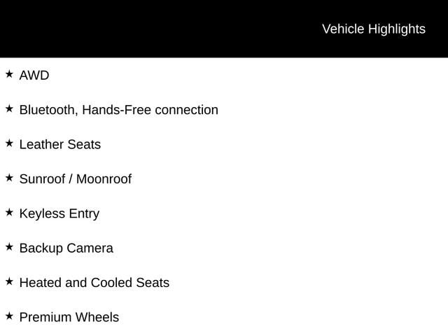 AWD, Bluetooth, Hands-Free connection, Leather Seats, Sunroof / Moonroof, Keyless Entry, Backup Camera, Heated and Cooled Seats, Premium Wheels, Power Liftgate, Heated Rear Seats, Heated Steering Wheel.