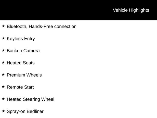 Bluetooth, Hands-Free connection, Keyless Entry, Backup Camera, Heated Seats, Premium Wheels, Remote Start, Heated Steering Wheel, Spray-on Bedliner, 4WD.