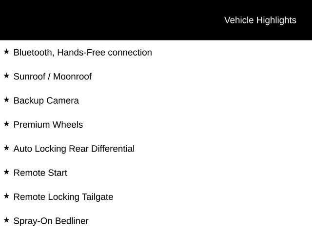 Bluetooth, Hands-Free connection, Sunroof / Moonroof, Backup Camera, Premium Wheels, Auto Locking Rear Differential, Remote Start, Remote Locking Tailgate, Spray-On Bedliner, 4WD.