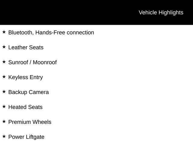 Bluetooth, Hands-Free connection, Leather Seats, Sunroof / Moonroof, Keyless Entry, Backup Camera, Heated Seats, Premium Wheels, Power Liftgate, Heated Steering Wheel.