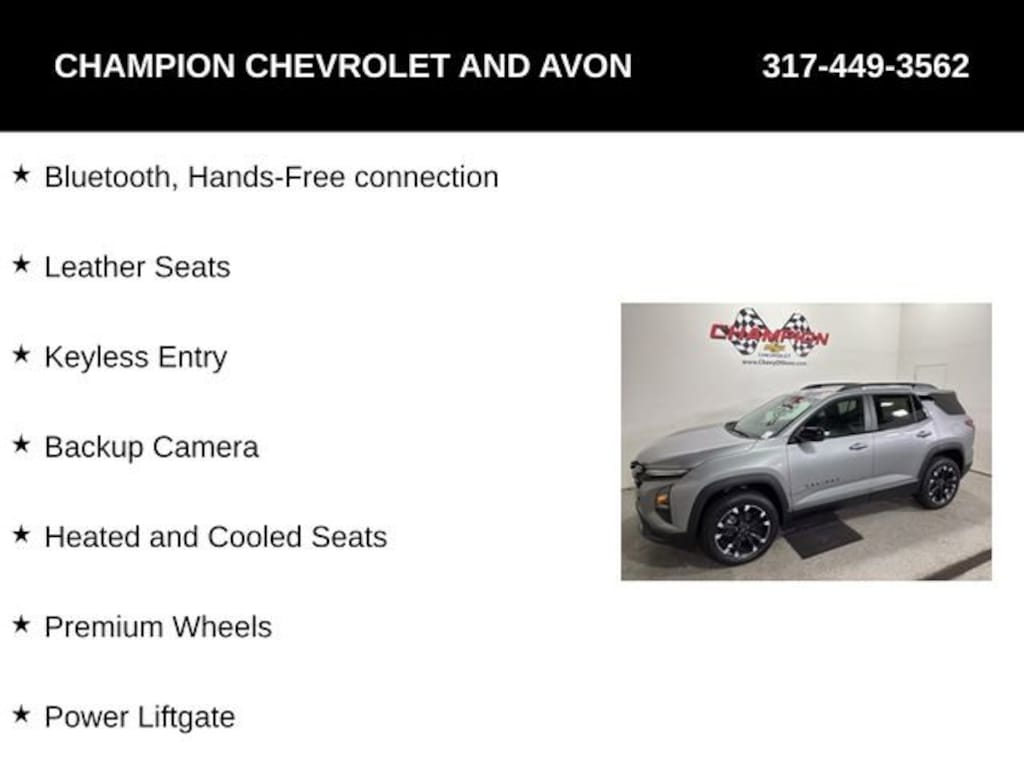 Bluetooth, Hands-Free connection, Leather Seats, Keyless Entry, Backup Camera, Heated and Cooled Seats, Premium Wheels, Power Liftgate.