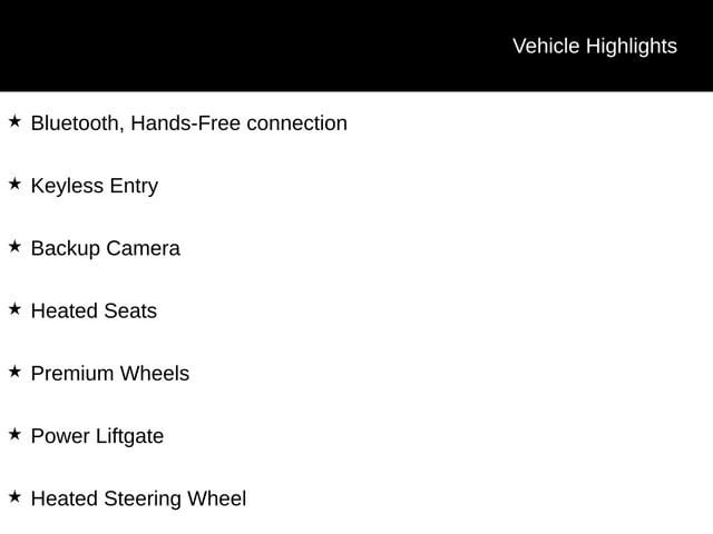 Bluetooth, Hands-Free connection, Keyless Entry, Backup Camera, Heated Seats, Premium Wheels, Power Liftgate, Heated Steering Wheel.