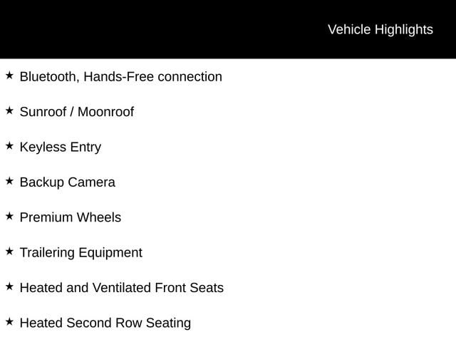 Bluetooth, Hands-Free connection, Sunroof / Moonroof, Keyless Entry, Backup Camera, Premium Wheels, Trailering Equipment, Heated and Ventilated Front Seats, Heated Second Row Seating, Interior Camera, Max Trailering Package.