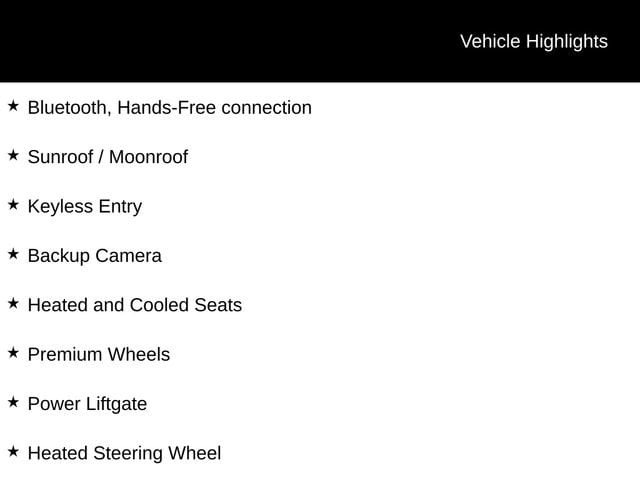 Bluetooth, Hands-Free connection, Sunroof / Moonroof, Keyless Entry, Backup Camera, Heated and Cooled Seats, Premium Wheels, Power Liftgate, Heated Steering Wheel, AWD.