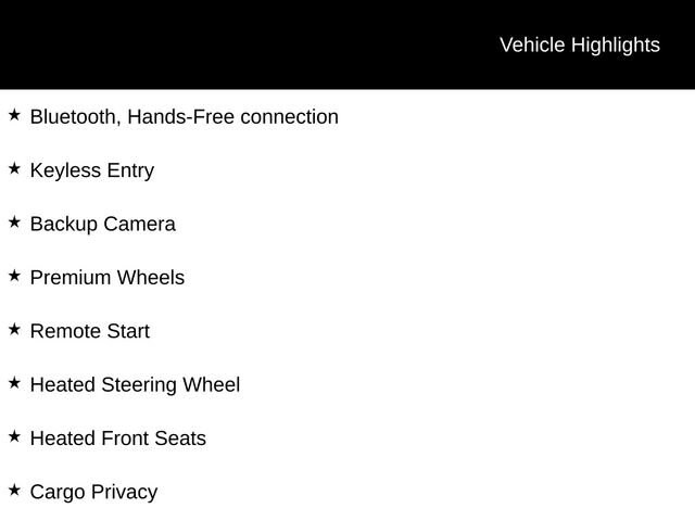 Bluetooth, Hands-Free connection, Keyless Entry, Backup Camera, Premium Wheels, Remote Start, Heated Steering Wheel, Heated Front Seats, Cargo Privacy.