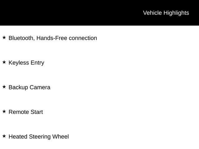 Bluetooth, Hands-Free connection, Keyless Entry, Backup Camera, Remote Start, Heated Steering Wheel.