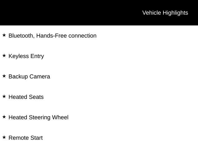 Bluetooth, Hands-Free connection, Keyless Entry, Backup Camera, Heated Seats, Heated Steering Wheel, Remote Start.