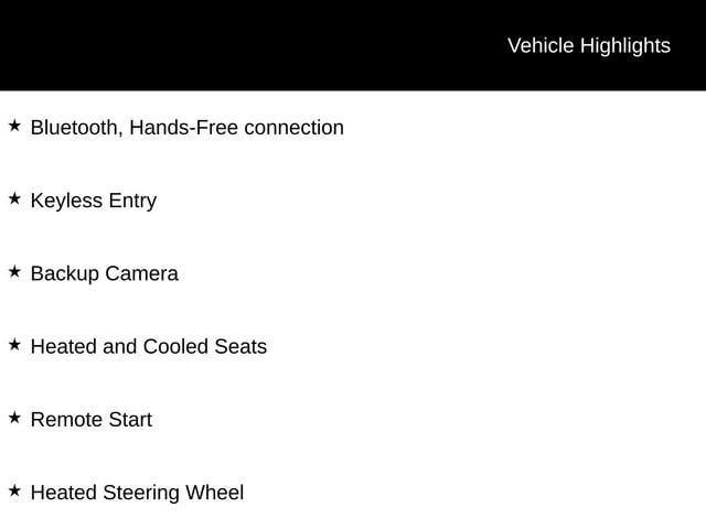 Bluetooth, Hands-Free connection, Keyless Entry, Backup Camera, Heated and Cooled Seats, Remote Start, Heated Steering Wheel.