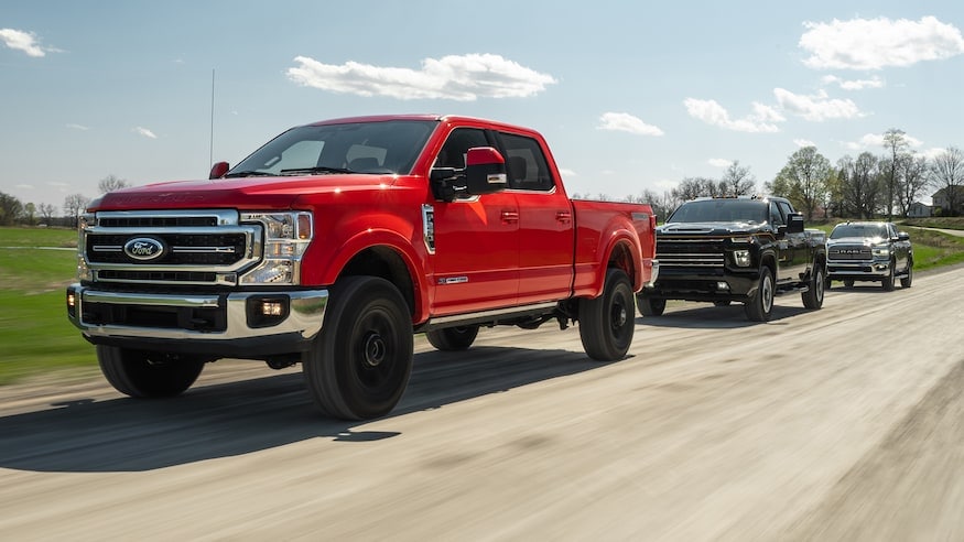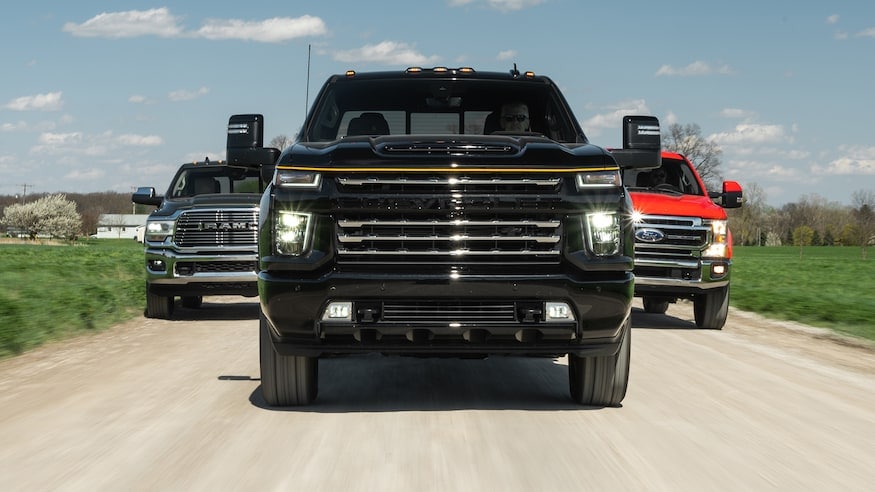 The heavy-duty Rams are currently our picks in both of those categories, having claimed our 2020 Truck of the Year calipers against competition that included then-new competitors from Chevy and GMC. The contest pitted Ram's high-output Cummins (now rated at 420 hp and 1,075 lb-ft) against GM's 445-hp, 910-lb-ft Duramax, but in a 3/4-ton Ram, the Cummins produces just 370 hp and 850 lb-ft. Chevy doesn't downrate its Duramax diesel for 3/4-ton duty, and it's mated to a 10-speed automatic that tops the Ram's gearbox by four ratios. Last year's revised Ford Super Duty trucks competed for our 2021 Truck of the Year laurels, sporting a Power Stroke diesel and 10-speed automatic combo good for a whopping 475 hp and 1,050 lb-ft in everything from the F-250 to the F-450. But the Ford Super Duty failed to capture the calipers, so this contest is truly up for grabs.