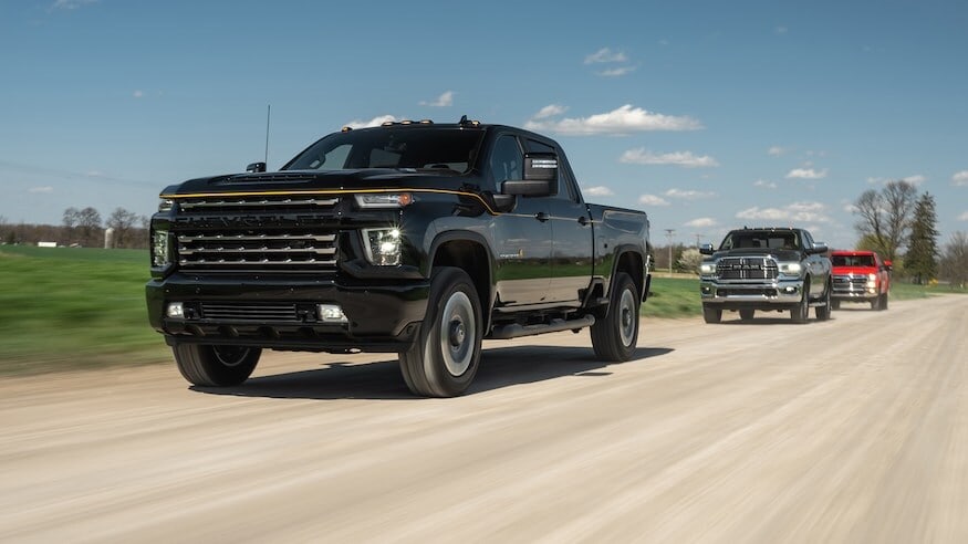 The heaviest loads and trailers demand a 1-ton diesel dually pickup. But those are unwieldy to maneuver, and their ride quality can be downright punishing when they're not fully loaded. Plus, to tow more than half of those trucks' max capacity you need a commercial driving license (CDL). Scale back your towing needs to "operator license" territory (26,000 pounds for the truck and trailer combined), and you'll find a 3/4-ton diesel pickup with single rear wheels (SRWs) fits the bill much more comfortably. Our MotorTrend Ultimate Car Rankings already assess 1-ton diesel (350 or 3500) pickups and 3/4-ton gasoline-burners, so this 3/4-ton diesel truck comparison explores new territory.
