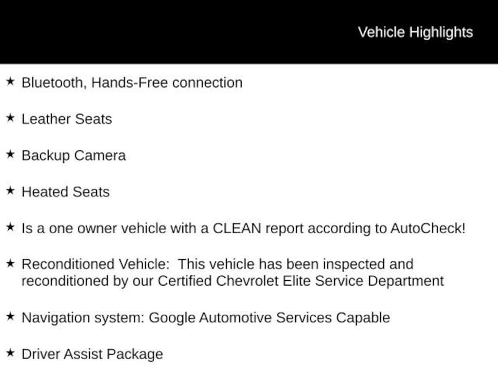Bluetooth, Hands-Free connection, Leather Seats, Backup Camera, Heated Seats, Is a one owner vehicle with a CLEAN report according to AutoCheck!, Reconditioned Vehicle: This vehicle has been inspected and reconditioned by our Certified Chevrolet Elite Service Department, Driver Assist Package, Enhanced Automatic Parking Assist, HD Surround Vision, Intersection Automatic Emergency Braking, Navigation system: Google Automotive Services Capable, Power Liftgate, Power-Folding Outside Heated Mirrors, Rear Pedestrian Alert, Side Bicyclist Alert.