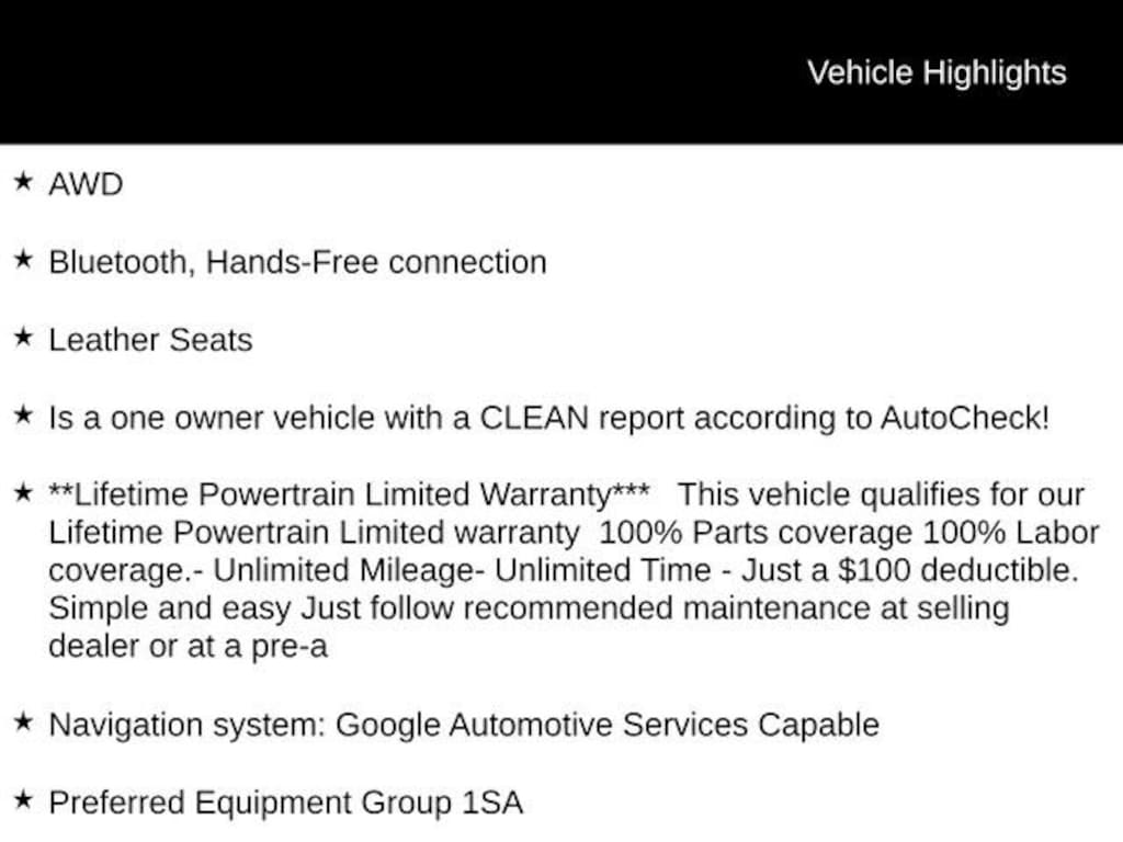 AWD, Bluetooth, Hands-Free connection, Leather Seats, Is a one owner vehicle with a CLEAN report according to AutoCheck!, **Lifetime Powertrain Limited Warranty*** This vehicle qualifies for our Lifetime Powertrain Limited warranty 100% Parts coverage 100% Labor coverage.- Unlimited Mileage- Unlimited Time - Just a $100 deductible. Simple and easy Just follow recommended maintenance at selling dealer or at a pre-a, Apple CarPlay/Android Auto, Electronic Cruise Control w/Set & Resume Speed, Front & Rear Park Assist, HD Rear Vision Camera, Manual-Folding Outside Heated Mirrors, Navigation system: Google Automotive Services Capable, Power Liftgate, Preferred Equipment Group 1SA, Rear Power Liftgate.