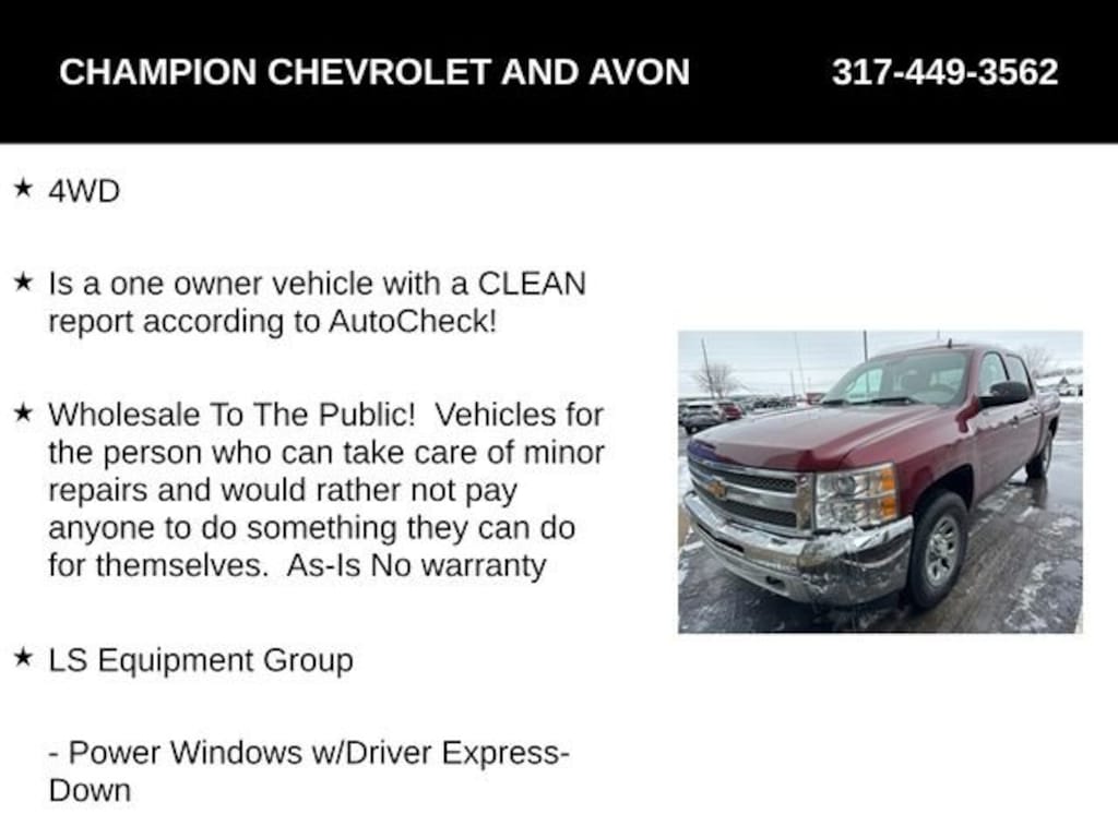 4WD, Is a one owner vehicle with a CLEAN report according to AutoCheck!, Wholesale To The Public! Vehicles for the person who can take care of minor repairs and would rather not pay anyone to do something they can do for themselves. As-Is No warranty, 4-Speed Automatic with Overdrive, 4WD, Dark Titanium Cloth, 6 Speaker Audio System Feature, Body-Colored Bodyside Moldings, Chrome Grille Surround, Color-Keyed Carpeting w/Rubberized Vinyl Floormats, Driver-Side Manual Lumbar Control Seat Adjuster, Heated Power-Adjustable Black Outside Mirrors, Heavy-Duty Auxiliary External Transmission Oil Cooler, Heavy-Duty Handling/Trailering Suspension Package, Heavy-Duty Rear Automatic Locking Differential, Heavy-Duty Trailering Package (Retail), LS Equipment Group, Power Door Locks w/Remote Keyless Entry, Power Windows w/Driver Express-Down, Solar-Ray Deep-Tinted Glass.Odometer is 10805 miles below market average!Tax, title, license and $249.00 document preparation fee are extra. We make every reasonable effort possible to present information and pricing that is true and accurate. Some information provided may come from third party sources. To ensure your complete satisfaction, please verify the accuracy prior to your purchase. It is the responsibility of the consumer to verify the accuracy of information listed.