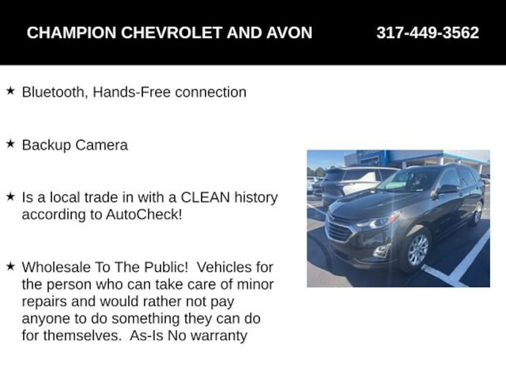 Bluetooth, Hands-Free connection, Backup Camera, Is a local trade in with a CLEAN history according to AutoCheck!, Wholesale To The Public! Vehicles for the person who can take care of minor repairs and would rather not pay anyone to do something they can do for themselves. As-Is No warranty, 120-Volt Power Outlet, 2 USB Data Ports, 2 USB Data Ports w/SD Card Reader, Confidence & Convenience Package, Driver Confidence Package, Driver Convenience Package, HD Rear Vision Camera, Infotainment Package, Power Sunroof, Radio: Chevrolet Infotainment 3 Plus System w/Navi, Rear Power Liftgate, Sun & Navigation Package (DISC), Universal Home Remote.