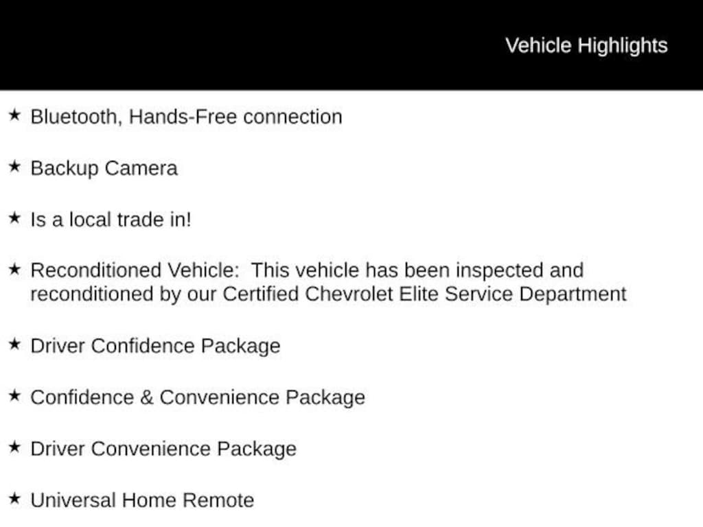 Bluetooth, Hands-Free connection, Backup Camera, Is a local trade in!, Reconditioned Vehicle: This vehicle has been inspected and reconditioned by our Certified Chevrolet Elite Service Department, Confidence & Convenience Package, Driver Confidence Package, Driver Convenience Package, Rear Power Liftgate, Universal Home Remote.