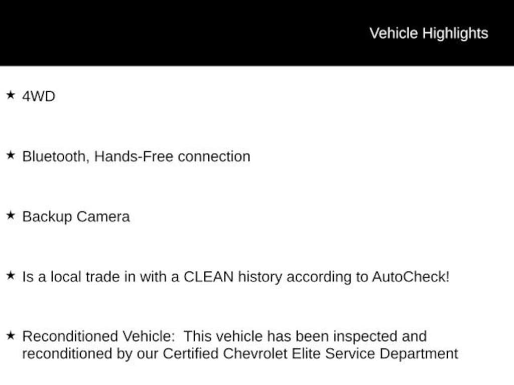 4WD, Bluetooth, Hands-Free connection, Backup Camera, Is a local trade in with a CLEAN history according to AutoCheck!, Reconditioned Vehicle: This vehicle has been inspected and reconditioned by our Certified Chevrolet Elite Service Department, 8-Speed Automatic, 4WD, Jet Black w/Cloth Seat Trim.