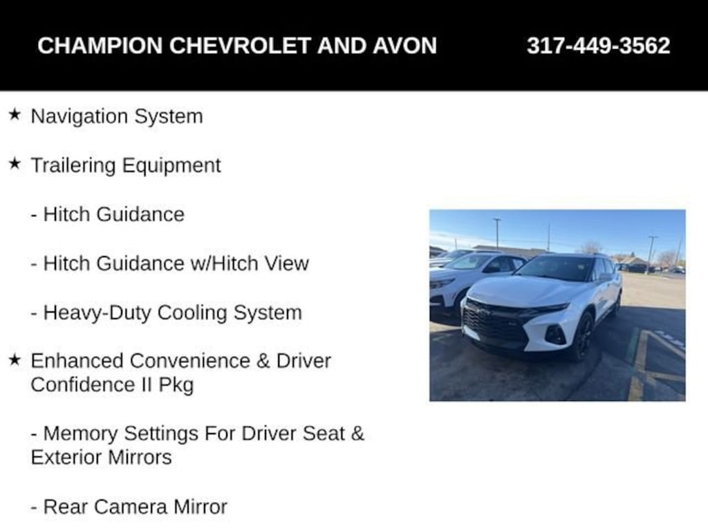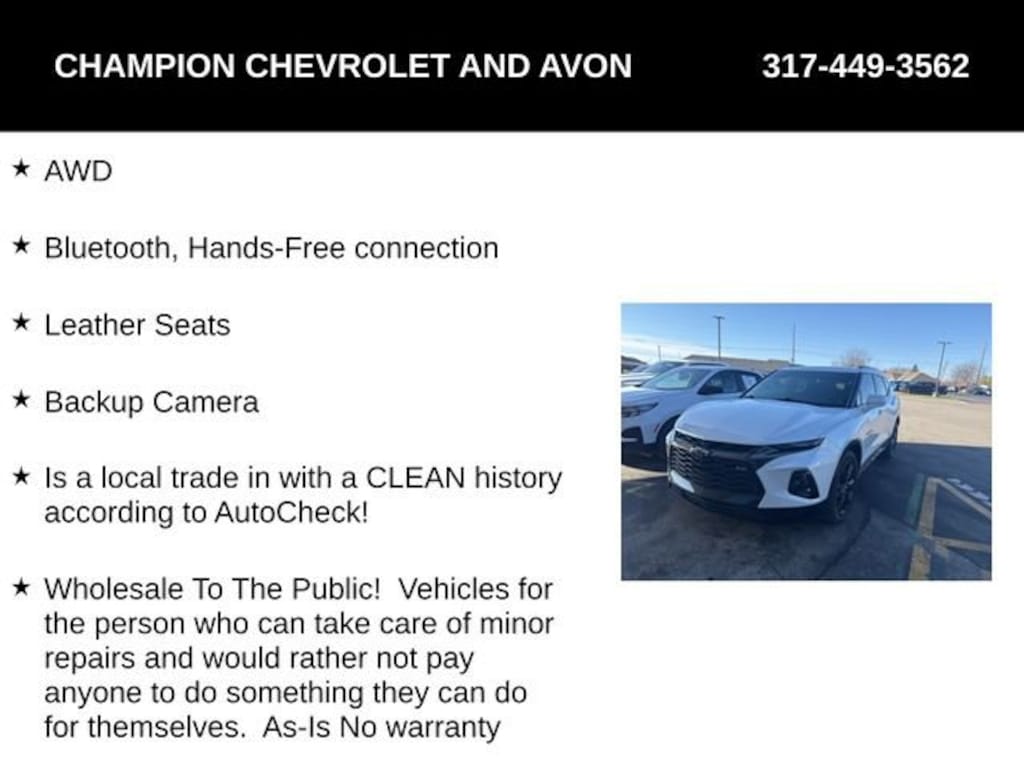 This is one impressive car. I purchased the Chevrolet Blazer with 6 cylinder engine. It has everything I want. Great acceleration, Great styling, Quiet engine, Well equiped, I really like the turn signals in the mirrors, push button start, blind spot monitoring, cross traffic monitoring, Continental Tires, and easy pairing of cell phone. I did not get AWD or GPS. There is nothing, I would change and for the price, a great deal to boot. You won't be disappointed.… - 5.0