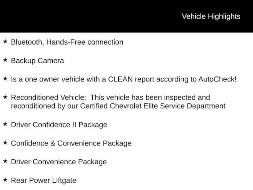 Bluetooth, Hands-Free connection, Backup Camera, Is a one owner vehicle with a CLEAN report according to AutoCheck!, Reconditioned Vehicle: This vehicle has been inspected and reconditioned by our Certified Chevrolet Elite Service Department, Confidence & Convenience Package, Driver Confidence II Package, Driver Convenience Package, Rear Power Liftgate.