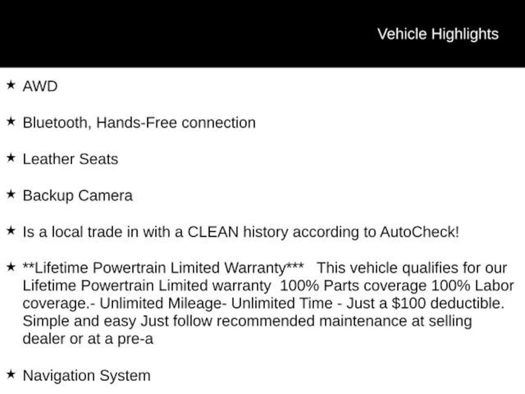 AWD, Bluetooth, Hands-Free connection, Leather Seats, Backup Camera, Is a local trade in with a CLEAN history according to AutoCheck!, **Lifetime Powertrain Limited Warranty*** This vehicle qualifies for our Lifetime Powertrain Limited warranty 100% Parts coverage 100% Labor coverage.- Unlimited Mileage- Unlimited Time - Just a $100 deductible. Simple and easy Just follow recommended maintenance at selling dealer or at a pre-a, AWD, Enhanced Convenience Package, Heated Driver & Front Passenger Seats, Heated Rear Outboard Seating Positions, Heated Steering Wheel, Memory Settings For Driver Seat & Exterior Mirrors, Navigation System, Power Liftgate, Power Tilt & Telescoping Steering Column, Preferred Equipment Group 1RS, Ventilated Driver & Front Passenger Seats.