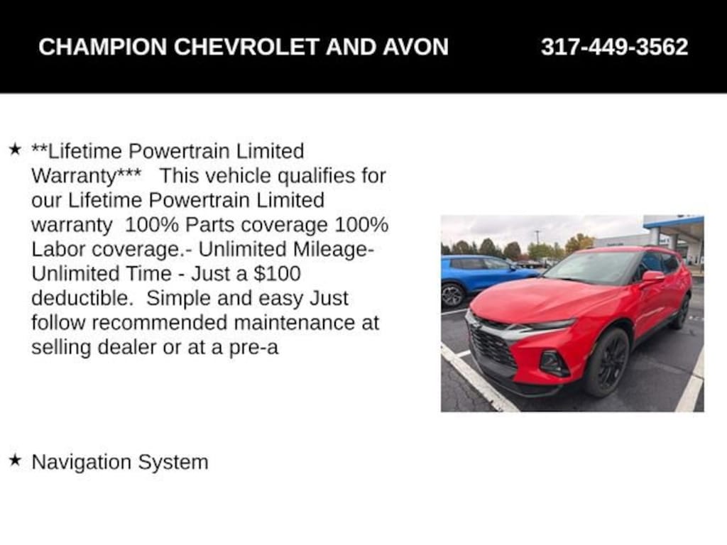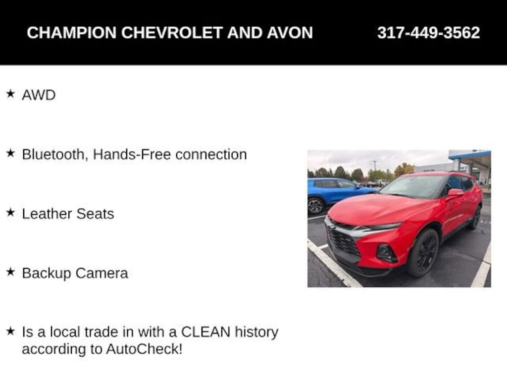 This is one impressive car. I purchased the Chevrolet Blazer with 6 cylinder engine. It has everything I want. Great acceleration, Great styling, Quiet engine, Well equiped, I really like the turn signals in the mirrors, push button start, blind spot monitoring, cross traffic monitoring, Continental Tires, and easy pairing of cell phone. I did not get AWD or GPS. There is nothing, I would change and for the price, a great deal to boot. You won't be disappointed.… - 5.0