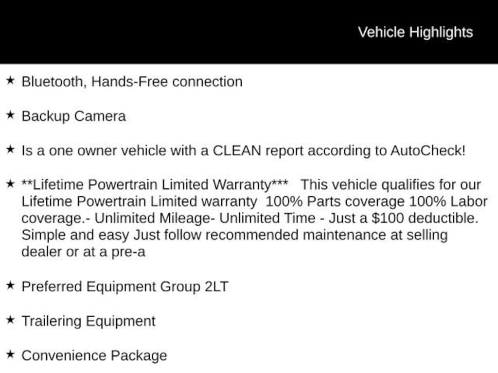 Bluetooth, Hands-Free connection, Backup Camera, Is a one owner vehicle with a CLEAN report according to AutoCheck!, **Lifetime Powertrain Limited Warranty*** This vehicle qualifies for our Lifetime Powertrain Limited warranty 100% Parts coverage 100% Labor coverage.- Unlimited Mileage- Unlimited Time - Just a $100 deductible. Simple and easy Just follow recommended maintenance at selling dealer or at a pre-a, Adaptive Cruise Control, Black Roof-Mounted Side Rails, Convenience Package, Enhanced Automatic Emergency Braking, Hitch Guidance, Inside Rear-View Auto-Dimming Mirror, Preferred Equipment Group 2LT, Rear Power Programmable Liftgate, Steering wheel mounted audio controls, Trailering Equipment, Universal Home Remote, Wireless Charging.Odometer is 2528 miles below market average! 22/29 City/Highway MPGTax, title, license and $249.00 document preparation fee are extra. We make every reasonable effort possible to present information and pricing that is true and accurate. Some information provided may come from third party sources. To ensure your complete satisfaction, please verify the accuracy prior to your purchase. It is the responsibility of the consumer to verify the accuracy of information listed.
