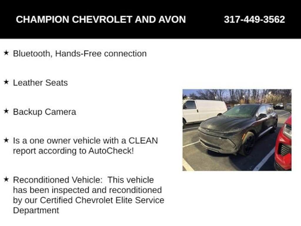 Elevate your driving experience with the 2024 Chevrolet Equinox EV RS, a revolutionary electric SUV that seamlessly blends power, style, and cutting-edge technology. This one-owner vehicle, meticulously reconditioned by our Certified Chevrolet Elite Service Department, is ready to take you on an unparalleled journey.Boasting an impressive array of features, the Equinox EV RS is designed to exceed your expectations. Key highlights include: Bluetooth and hands-free connectivity Luxurious leather seating Backup camera for enhanced safety and convenience All-Weather Liner Package for superior protection Google built-in navigation system (select service plan required) Power liftgate for effortless cargo loadingUnder the hood, the Equinox EV RS delivers an exceptional electric driving experience with its powerful Electric Drive Unit and Front-Wheel Drive configuration. Imagine the thrill of instant acceleration and smooth, responsive handling, all while enjoying the efficiency and environmental benefits of electric mobility.Step inside and you'll be greeted by a spacious, well-appointed cabin that caters to your every need. The 17.7 Advanced Color LCD Display keeps you connected and informed, while the 6-speaker audio system provides a premium listening experience. Dual-zone automatic climate control, heated front seats, and a heated steering wheel ensure your comfort in any weather.Safety is paramount in the Equinox EV RS, with features like OnStar and Chevrolet connected services, dual front and side impact airbags, and Electronic Stability Control keeping you and your loved ones secure on the road.Elevate your driving experience and make a statement with the 2024 Chevrolet Equinox EV RS. Schedule a test drive today and discover the future of electric SUVs.Tax, title, license and $249.00 document preparation fee are extra. We make every reasonable effort possible to present information and pricing that is true and accurate. Some information provided may come from third party sources. To ensure your complete satisfaction, please verify the accuracy prior to your purchase. It is the responsibility of the consumer to verify the accuracy of information listed.
