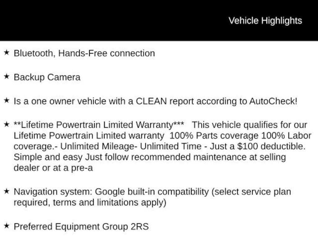 Bluetooth, Hands-Free connection, Backup Camera, Is a one owner vehicle with a CLEAN report according to AutoCheck!, **Lifetime Powertrain Limited Warranty*** This vehicle qualifies for our Lifetime Powertrain Limited warranty 100% Parts coverage 100% Labor coverage.- Unlimited Mileage- Unlimited Time - Just a $100 deductible. Simple and easy Just follow recommended maintenance at selling dealer or at a pre-a, Navigation system: Google built-in compatibility (select service plan required, terms and limitations apply), Power Dual Panel Panoramic Sliding Sunroof, Power Liftgate, Preferred Equipment Group 2RS, Steering wheel mounted audio controls.