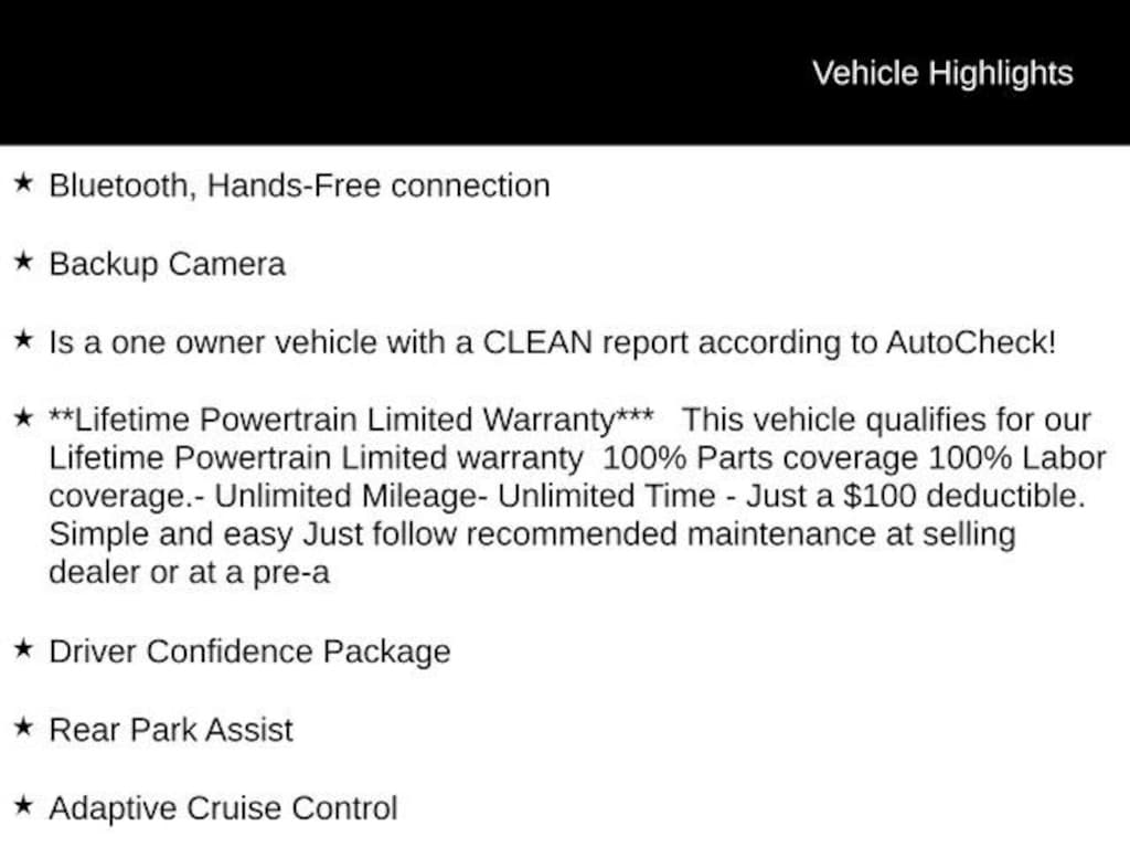 Bluetooth, Hands-Free connection, Backup Camera, Is a one owner vehicle with a CLEAN report according to AutoCheck!, **Lifetime Powertrain Limited Warranty*** This vehicle qualifies for our Lifetime Powertrain Limited warranty 100% Parts coverage 100% Labor coverage.- Unlimited Mileage- Unlimited Time - Just a $100 deductible. Simple and easy Just follow recommended maintenance at selling dealer or at a pre-a, Adaptive Cruise Control, Driver Confidence Package, Lane Change Alert w/Side Blind Zone Alert, Rear Cross-Traffic Alert, Rear Park Assist.