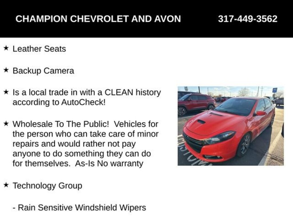 Leather Seats, Backup Camera, Is a local trade in with a CLEAN history according to AutoCheck!, Wholesale To The Public! Vehicles for the person who can take care of minor repairs and would rather not pay anyone to do something they can do for themselves. As-Is No warranty, 506 Watt Amplifier, 9 Alpine Speakers w/Subwoofer, Auto High Beam Headlamp Control, Blind Spot & Cross Path Detection, High-Intensity Discharge Headlamps, Intrusion Alarm, MOPAR Black Front Chin Spoiler, MOPAR Black Side Sills, MOPAR Dual Exhaust Exterior Package, Mopar Rear Air Diffuser, ParkSense Rear Park Assist System, Power Express Open/Close Sunroof, Rain Sensitive Windshield Wipers, Sun/Sound Group, Technology Group.22/31 City/Highway MPGTax, title, license and $249.00 document preparation fee are extra. We make every reasonable effort possible to present information and pricing that is true and accurate. Some information provided may come from third party sources. To ensure your complete satisfaction, please verify the accuracy prior to your purchase. It is the responsibility of the consumer to verify the accuracy of information listed.