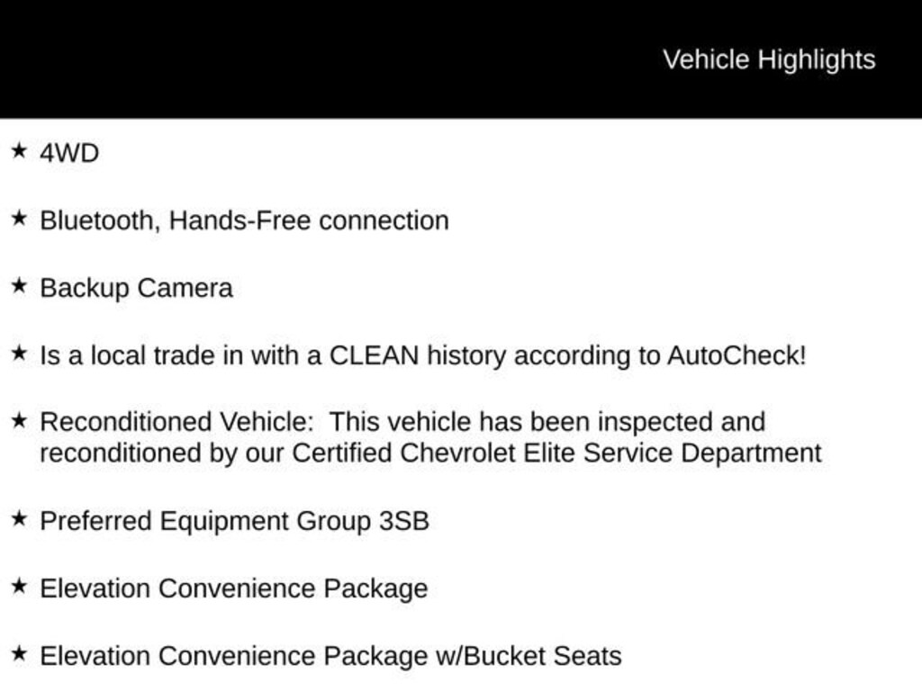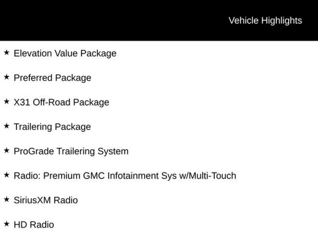 4WD, Bluetooth, Hands-Free connection, Backup Camera, Is a local trade in with a CLEAN history according to AutoCheck!, Reconditioned Vehicle: This vehicle has been inspected and reconditioned by our Certified Chevrolet Elite Service Department, 8-Speed Automatic, 4WD, Black Cloth, 10-Way Power Driver Seat Adjuster w/Lumbar, 12-Volt Rear Auxiliary Power Outlet, 120-Volt Instrument Panel Power Outlet, 2 USB Ports, Body-Color Surround Grille, Color-Keyed Carpeting Floor Covering, Compass, Deep-Tinted Glass, Dual Exhaust w/Premium Tips, Dual-Zone Automatic Climate Control, Electric Rear-Window Defogger, Electrical Lock Control Steering Column, Elevation Convenience Package, Elevation Convenience Package w/Bucket Seats, Elevation Value Package, Floor Mounted Console, Front Bucket Seats, Front Frame-Mounted Black Recovery Hooks, Front Rubberized-Vinyl Floor Mats, GMC 4G LTE, GMC Connected Access, HD Radio, HD Rear Vision Camera, Heated Driver & Front Passenger Seating, Heated Steering Wheel, Heavy-Duty Rear Locking Differential, High-Capacity Air Filter, Hill Descent Control, Hitch Guidance w/Hitch View, In-Vehicle Trailering App, Keyless Open & Start, LED Cargo Area Lighting, Manual Tilt Wheel Steering Column, Manual Tilt-Wheel & Telescoping Steering Column, Off-Road Suspension, OnStar & GMC Connected Services Capable, Power Door Locks, Power Front Windows w/Driver Express Up/Down, Power Front Windows w/Passenger Express Down, Power Rear Windows w/Express Down, Power Sliding Rear Window w/Rear Defogger, Preferred Equipment Group 3SB, Preferred Package, Premium Bose 7-Speaker Sound System, ProGrade Trailering System, Radio: Premium GMC Infotainment Sys w/Multi-Touch, Rear Dual USB Charging-Only Ports, Rear Rubberized-Vinyl Floor Mats, Rear Wheelhouse Liners, Remote Vehicle Starter System, Single-Zone Manual/Semi-Automatic Air Conditioning, SiriusXM Radio, Steering Wheel Audio Controls, Theft Deterrent System (Unauthorized Entry), Trailer Tire Pressure Monitor System, Trailering Package, Universal Home Remote, X31 Hard Badge, X31 Off-Road Package.