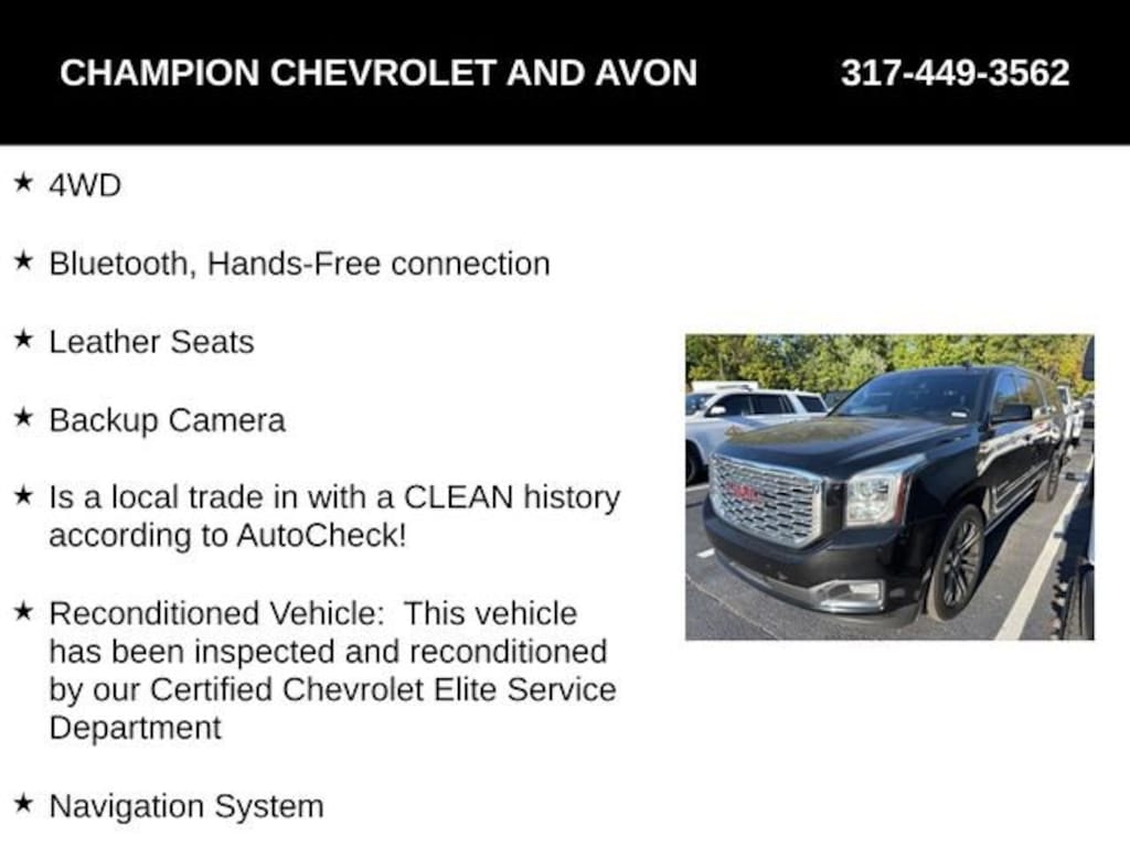 4WD, Bluetooth, Hands-Free connection, Leather Seats, Backup Camera, Is a local trade in with a CLEAN history according to AutoCheck!, Reconditioned Vehicle: This vehicle has been inspected and reconditioned by our Certified Chevrolet Elite Service Department, 4WD, 3rd Row DVD Screen, 4-Wheel Antilock Disc Brakes, 4-Wheel Disc & 4-Wheel VAC Power Antilock Brakes, 5 Auxiliary 12-volt Power Outlets, Advanced Adaptive Cruise Control, Black Assist Steps w/Chrome Strip, Bose Active Noise Cancellation, Denali Ultimate Package, Enhanced Driver Alert Package, Enhanced Security Package, Forward Automatic Braking, Forward Collision Alert, Hands Free Power Programmable Rear Liftgate, Heated Leather-Wrapped Steering Wheel, Inside Rear-View Auto-Dimming Mirror, Integrated Trailer Brake Controller, IntelliBeam Automatic High Beam On/Off, Lane Change Alert w/Side Blind Zone Alert, Lane Keep Assist w/Lane Departure Warning, Low Speed Forward Automatic Braking, Magnetic Ride Control Suspension Package, Memory Package, Navigation System, Open Road Package, Passive Entry System, Power Liftgate, Power Release 2nd Row Bucket Seats, Power Tilt & Telescopic Steering Column, Power Tilt-Sliding Sunroof w/Express-Open/Close, Power-Adjustable Pedals For Accelerator & Brake, Preferred Equipment Group 5SA, Push Button Keyless Start, Pwr Retractable Assist Steps w/Perimeter Lighting, Rear Cross Traffic Alert, Universal Home Remote, Wireless Charging.