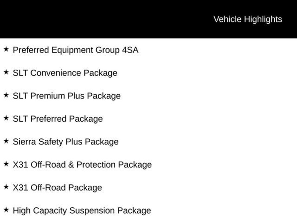 4WD, Bluetooth, Hands-Free connection, Leather Seats, Backup Camera, Is a one owner vehicle with a CLEAN report according to AutoCheck!, **Lifetime Powertrain Limited Warranty*** This vehicle qualifies for our Lifetime Powertrain Limited warranty 100% Parts coverage 100% Labor coverage.- Unlimited Mileage- Unlimited Time - Just a $100 deductible. Simple and easy Just follow recommended maintenance at selling dealer or at a pre-a, 10-Speed Automatic, 4WD, Dark Walnut/Slate Leather, 120-Volt Instrument Panel Power Outlet, 170 Amp Alternator, 2 Charge/Data USB Ports, 2 Type-C Charge-Only Rear USB Ports, 20 Polished Aluminum Wheels, 6-Speaker Audio System Feature, Adaptive Cruise Control, All-Weather Floor Liner (LPO), Auto-Locking Rear Differential, Auxiliary External Transmission Oil Cooler, Chrome Header & Chrome Grille Insert Bars, Chrome Wheel To Wheel Assist Steps, Color-Keyed Carpeting Floor Covering, Compass, Deep-Tinted Glass, Electric Rear-Window Defogger, Electrical Steering Column Lock, Floor-Mounted Center Console, Front Bucket Seats, Front Frame-Mounted Black Recovery Hooks, Front Rainsensing Wipers, GMC Connected Access Capable, HD Rear Vision Camera, HD Surround Vision, Heated 2nd Row Outboard Seats, High Capacity Suspension Package, Hitch Guidance w/Hitch View, In-Vehicle Trailering App, Integrated Trailer Brake Controller, Keyless Open & Start, LED Cargo Area Lighting, Manual Tilt-Wheel & Telescoping Steering Column, Navigation System, OnStar & GMC Connected Services Capable, Perimeter Lighting, Power Door Locks, Power Front Passenger Windows w/Express Up/Down, Power Front Windows w/Driver Express Up/Down, Power Rake & Telescoping Steering Column, Power Rear Windows w/Express Down, Power Sliding Rear Window w/Rear Defogger, Power Sunroof, Preferred Equipment Group 4SA, Premium Bose 7-Speaker Sound System, ProGrade Trailering System, Push Button Start, Rear Cross Traffic Braking, Rear Pedestrian Detection, Rear Wheelhouse Liners, Remote Vehicle Starter System, Safety Alert Seat, Sierra Safety Plus Package, SiriusXM w/360L, SLT Convenience Package, SLT Preferred Package, SLT Premium Plus Package, Spray-On Pickup Bed Liner w/GMC Logo, Steering Wheel Audio Controls, Theft Deterrent System (Unauthorized Entry), Trailer Camera Provisions, Trailer Side Blind Zone Alert, Trailering Package, Ultrasonic Front & Rear Park Assist, Universal Home Remote, Ventilated Driver & Front Passenger Seats, Wheels: 20 Polished Aluminum w/RFX, Wi-Fi Hotspot Capable, Wireless Charging, Wireless Phone Projection, X31 Off-Road & Protection Package, X31 Off-Road Package.