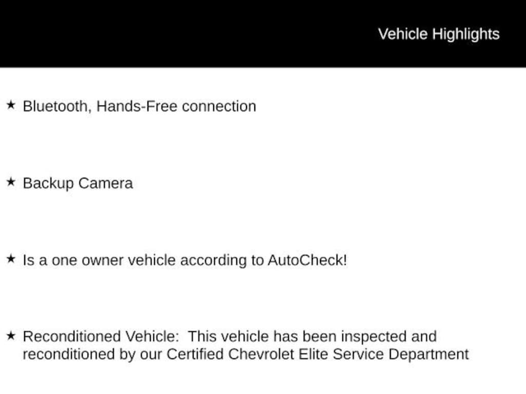 Bluetooth, Hands-Free connection, Backup Camera, Is a one owner vehicle according to AutoCheck!, Reconditioned Vehicle: This vehicle has been inspected and reconditioned by our Certified Chevrolet Elite Service Department, Black w/Cloth Seat Trim.