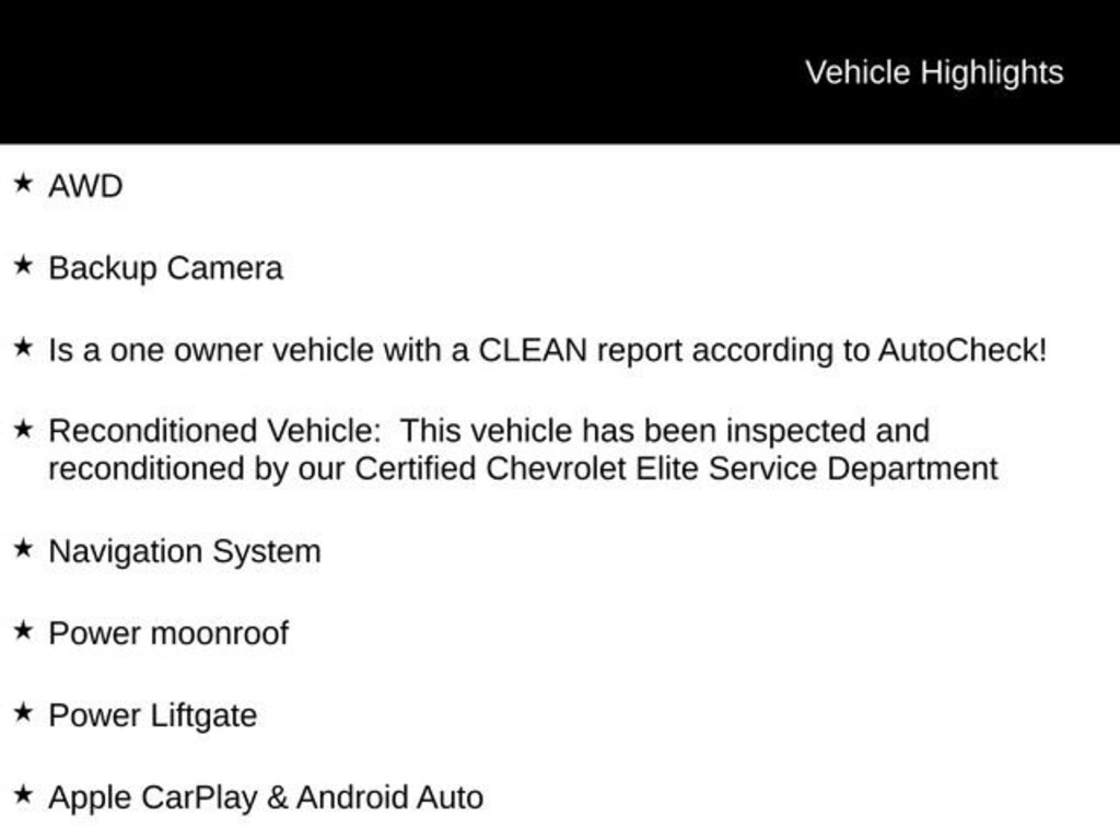 AWD, Backup Camera, Is a one owner vehicle with a CLEAN report according to AutoCheck!, Reconditioned Vehicle: This vehicle has been inspected and reconditioned by our Certified Chevrolet Elite Service Department, AWD, Apple CarPlay & Android Auto, Navigation System, Power Liftgate, Power moonroof.
