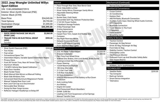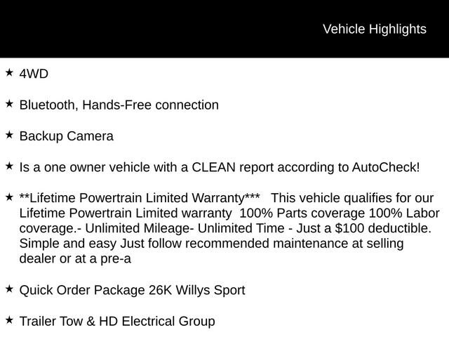 Discover the ultimate off-road companion in the 2022 Jeep Wrangler Unlimited Willys. This rugged and versatile SUV is ready to take you on unforgettable adventures, whether you're conquering the trails or navigating the city streets.Boasting an impressive array of features, this Wrangler Unlimited Willys is equipped to handle any terrain with ease. Highlights include:- Lifetime Powertrain Limited Warranty with 100% Parts and Labor Coverage- 4WD capabilities for unparalleled off-road performance- Backup camera for enhanced visibility and safety- Bluetooth connectivity for seamless hands-free communication- One-owner vehicle with a clean AutoCheck reportUnder the hood, you'll find a powerful 3.0L V6 Turbodiesel engine mated to an 8-speed automatic transmission, delivering an exceptional balance of power and efficiency. With an EPA-estimated 29 MPG on the highway, you can explore the great outdoors without constantly stopping for fuel.The Willys package adds a host of rugged features, including BF Goodrich brand tires, a black grille, Willys hood decal, and a 4-wheel drive swing gate decal. The Trailer Tow & HD Electrical Group further enhances the Wrangler's capabilities, with a Class II receiver hitch, 7- and 4-pin wiring harness, and a 240-amp alternator.Step inside and you'll be greeted by a well-appointed interior, complete with SiriusXM satellite radio, Apple CarPlay/Android Auto connectivity, and a ParkView rear backup camera. The Willys-specific interior touches, such as the cloth low-back bucket seats and Moab black aluminum wheels, add a touch of style and personality to this adventure-ready SUV.Whether you're tackling the great outdoors or navigating the urban jungle, the 2022 Jeep Wrangler Unlimited Willys is the perfect companion. Experience the unparalleled capability and versatility that only a Jeep can provide. Visit our showroom today and let us demonstrate how this exceptional vehicle can enhance your driving experience.Tax, title, license and $249.00 document preparation fee are extra. We make every reasonable effort possible to present information and pricing that is true and accurate. Some information provided may come from third party sources. To ensure your complete satisfaction, please verify the accuracy prior to your purchase. It is the responsibility of the consumer to verify the accuracy of information listed.
