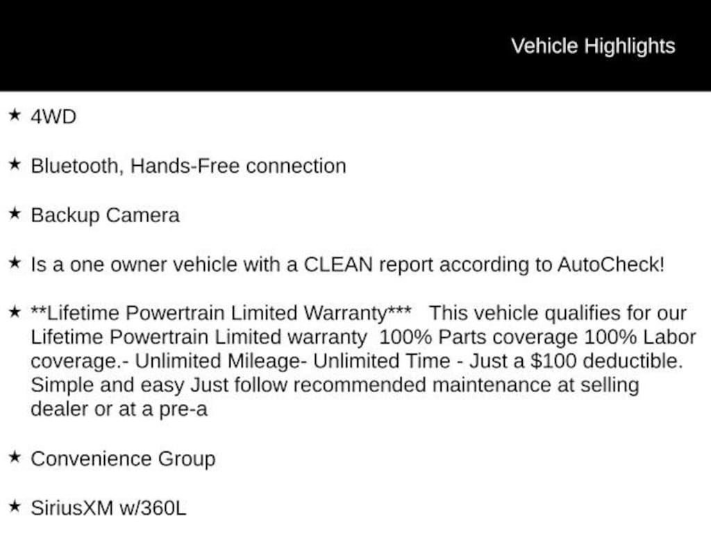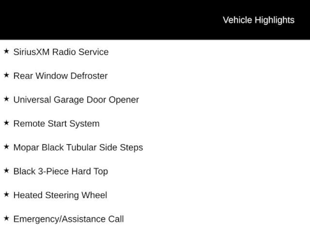 4WD, Bluetooth, Hands-Free connection, Backup Camera, Is a one owner vehicle with a CLEAN report according to AutoCheck!, **Lifetime Powertrain Limited Warranty*** This vehicle qualifies for our Lifetime Powertrain Limited warranty 100% Parts coverage 100% Labor coverage.- Unlimited Mileage- Unlimited Time - Just a $100 deductible. Simple and easy Just follow recommended maintenance at selling dealer or at a pre-a, Black 3-Piece Hard Top, Convenience Group, Emergency/Assistance Call, Freedom Panel Storage Bag, Heated Front Seats, Heated Steering Wheel, Mopar Black Tubular Side Steps, Rear Sliding Window, Rear Window Defroster, Remote Start System, SiriusXM Radio Service, SiriusXM w/360L, Universal Garage Door Opener.Tax, title, license and $249.00 document preparation fee are extra. We make every reasonable effort possible to present information and pricing that is true and accurate. Some information provided may come from third party sources. To ensure your complete satisfaction, please verify the accuracy prior to your purchase. It is the responsibility of the consumer to verify the accuracy of information listed.