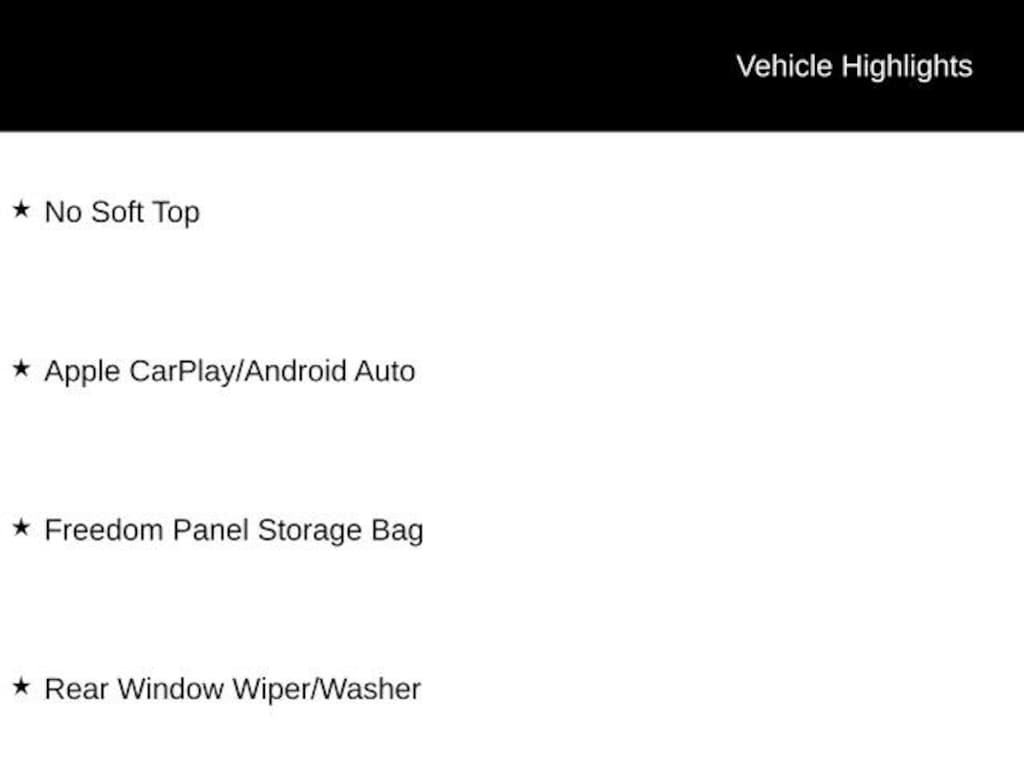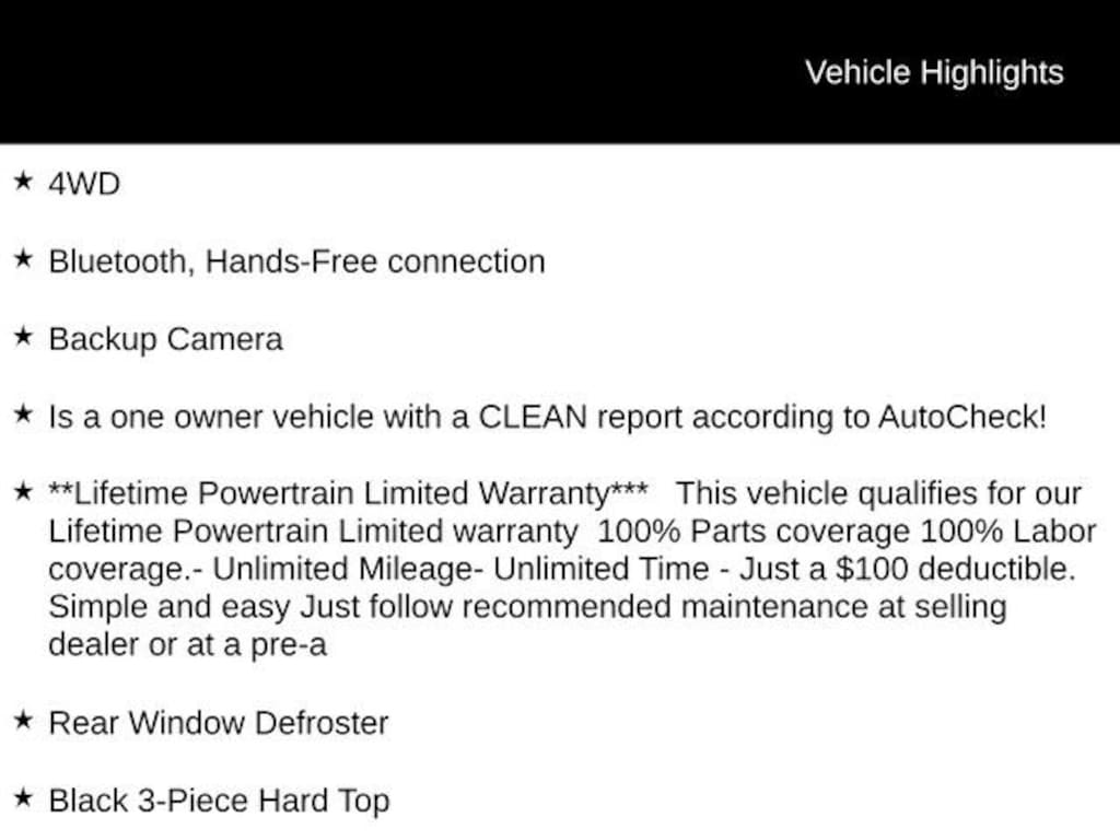 4WD, Bluetooth, Hands-Free connection, Backup Camera, Is a one owner vehicle with a CLEAN report according to AutoCheck!, **Lifetime Powertrain Limited Warranty*** This vehicle qualifies for our Lifetime Powertrain Limited warranty 100% Parts coverage 100% Labor coverage.- Unlimited Mileage- Unlimited Time - Just a $100 deductible. Simple and easy Just follow recommended maintenance at selling dealer or at a pre-a, Apple CarPlay/Android Auto, Black 3-Piece Hard Top, Freedom Panel Storage Bag, No Soft Top, Rear Window Defroster, Rear Window Wiper/Washer.