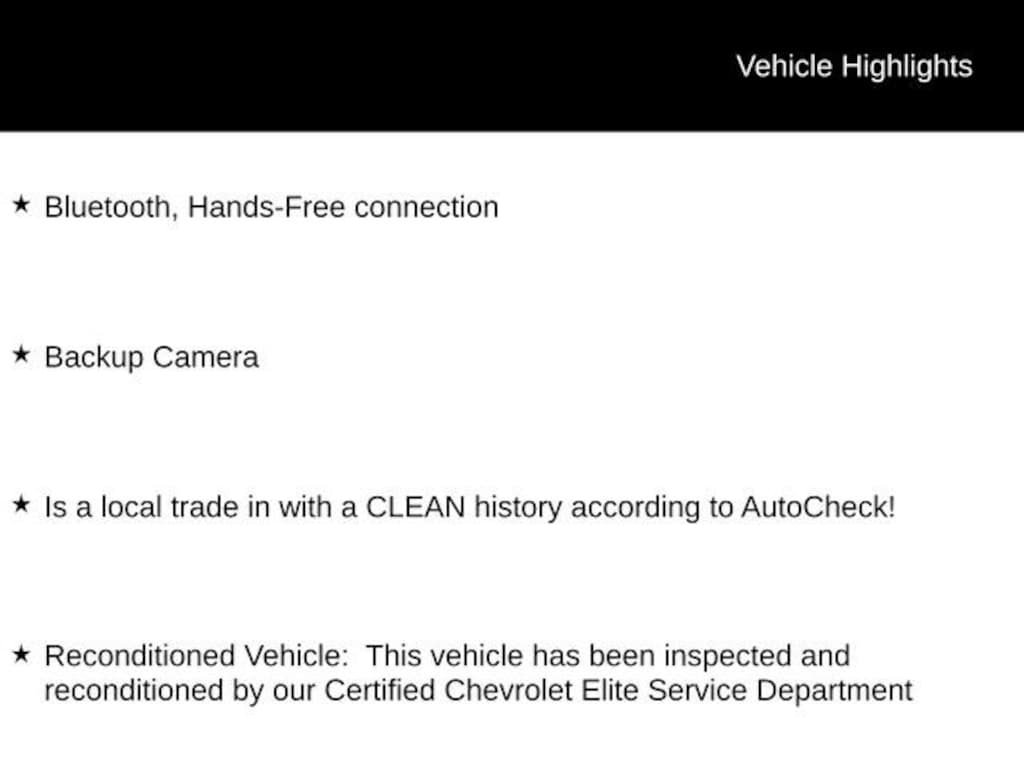 Bluetooth, Hands-Free connection, Backup Camera, Is a local trade in with a CLEAN history according to AutoCheck!, Reconditioned Vehicle: This vehicle has been inspected and reconditioned by our Certified Chevrolet Elite Service Department.23/30 City/Highway MPG Priced below KBB Fair Purchase Price!Tax, title, license and $249.00 document preparation fee are extra. We make every reasonable effort possible to present information and pricing that is true and accurate. Some information provided may come from third party sources. To ensure your complete satisfaction, please verify the accuracy prior to your purchase. It is the responsibility of the consumer to verify the accuracy of information listed.Awards:* JD Power Initial Quality Study (IQS)