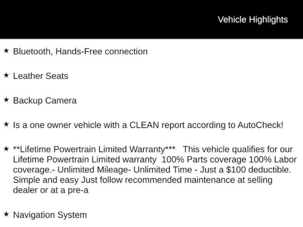 Bluetooth, Hands-Free connection, Leather Seats, Backup Camera, Is a one owner vehicle with a CLEAN report according to AutoCheck!, **Lifetime Powertrain Limited Warranty*** This vehicle qualifies for our Lifetime Powertrain Limited warranty 100% Parts coverage 100% Labor coverage.- Unlimited Mileage- Unlimited Time - Just a $100 deductible. Simple and easy Just follow recommended maintenance at selling dealer or at a pre-a, Navigation System.