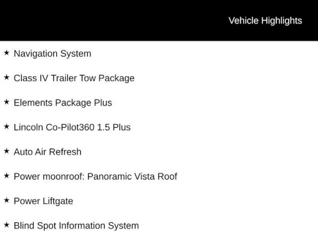 AWD, Bluetooth, Hands-Free connection, Leather Seats, Backup Camera, Has new tires, Has a CLEAN history according to AutoCheck!, **Lifetime Powertrain Limited Warranty*** This vehicle qualifies for our Lifetime Powertrain Limited warranty 100% Parts coverage 100% Labor coverage.- Unlimited Mileage- Unlimited Time - Just a $100 deductible. Simple and easy Just follow recommended maintenance at selling dealer or at a pre-a, 4-Pin & 7-Pin Connectors, Active Park Assist 2.0, Auto Air Refresh, Auto Heated/Ventilated Driver & Passenger Seats, Blind Spot Information System, Class IV Hitch & Wiring, Class IV Trailer Tow Package, Elements Package Plus, Evasive Steering Assist, Heated Steering Wheel, Heated VisioBlade Wipers, Heated/Ventilated 2nd Row Outboard Seats, Intelligent Adaptive Cruise Control, Lincoln Co-Pilot360 1.5 Plus, Navigation System, Power Liftgate, Power moonroof: Panoramic Vista Roof, Reverse Brake Assist, Smart Trailer Tow, Speed-Sensitive Wipers, Trailer Sway Control.