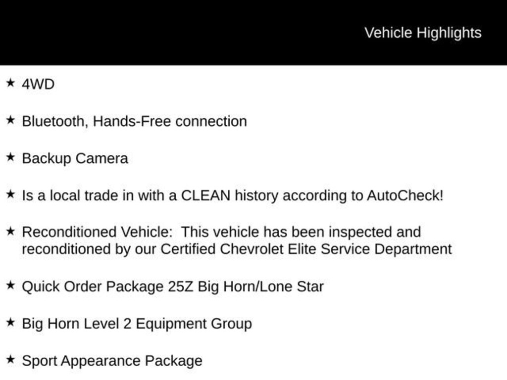 4WD, Bluetooth, Hands-Free connection, Backup Camera, Is a local trade in with a CLEAN history according to AutoCheck!, Reconditioned Vehicle: This vehicle has been inspected and reconditioned by our Certified Chevrolet Elite Service Department, 115V Auxiliary Power Outlet, 115V Auxiliary Rear Power Outlet, 2 USB Full Function/Charge Only Media Hub, 400W Inverter, 8.4 Touchscreen Display, Air Conditioning ATC w/Dual Zone Control, Auto-Dimming Exterior Driver Mirror, Auto-Dimming Rear-View Mirror, Big Horn IP Badge, Big Horn Level 2 Equipment Group, Black Interior Accents, Body Color Door Handles, Body Color Front Bumper, Body Color Rear Bumper w/Step Pads, Class IV Receiver Hitch, Cluster 7.0 TFT Color Display, Dampened Tailgate, Deluxe Cloth Bucket Seats, Exterior Mirrors Courtesy Lamps, Exterior Mirrors w/Memory, Exterior Mirrors w/Supplemental Signals, Foam Bottle Insert (Door Trim Panel), Glove Box Lamp, Grille B/Color Outline 1 Texture 2, Heated Front Seats, Heated Steering Wheel, Integrated Center Stack Radio, ParkSense Front/Rear Park Assist w/Stop, Power 4-Way Driver Lumbar Adjust, Power 8-Way Driver Seat, Power Adjustable Pedals, Power Heated Fold Away Mirrors, Power Heated Fold-Away Mirrors, Power-Folding Mirrors, Quick Order Package 25Z Big Horn/Lone Star, Radio: Uconnect 4 w/8.4 Display, Rear Dome w/On/Off Switch Lamp, Rear Power Sliding Window, Rear Window Defroster, Remote Start System, Security Alarm, Single Disc Remote CD Player, SiriusXM Satellite Radio, Sport Appearance Package, Steering Wheel Mounted Audio Controls, Sun Visors w/Illuminated Vanity Mirrors, Universal Garage Door Opener.Odometer is 16240 miles below market average! Priced below KBB Fair Purchase Price!Tax, title, license and $249.00 document preparation fee are extra. We make every reasonable effort possible to present information and pricing that is true and accurate. Some information provided may come from third party sources. To ensure your complete satisfaction, please verify the accuracy prior to your purchase. It is the responsibility of the consumer to verify the accuracy of information listed.Awards:* Motor Trend Automobiles of the year * 2019 KBB.com 10 Favorite New-for-2019 Cars * NACTOY 2019 North American Truck of the Year * 2019 KBB.com Best Auto Tech Awards * 2019 KBB.com 10 Best Road Trip Cars