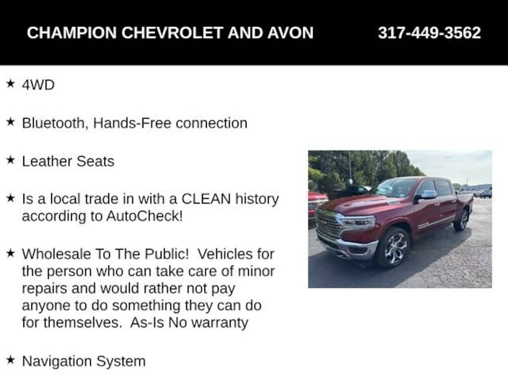 4WD, Bluetooth, Hands-Free connection, Leather Seats, Is a local trade in with a CLEAN history according to AutoCheck!, Wholesale To The Public! Vehicles for the person who can take care of minor repairs and would rather not pay anyone to do something they can do for themselves. As-Is No warranty, Adaptive Cruise Control w/Stop & Go, Advanced Brake Assist, Advanced Safety Group, Blind Spot & Cross Path Detection, Dome Dual LED Reading Lamp, Dual-Pane Panoramic Sunroof, Foam Bottle Insert (Door Trim Panel), Full Speed Forward Collision Warning Plus, harman/kardon 19 Speaker Premium Sound, Lane Keep Assist, LED Dome/Reading Lamp, Longhorn Level 1 Equipment Group, Navigation System, Parallel & Perp Park Assist w/Stop, Power Running Boards, Radio: Uconnect 12 w/Navigation, USB Host Flip, Ventilated Rear Seats, Wireless Charging Pad.Tax, title, license and $249.00 document preparation fee are extra. We make every reasonable effort possible to present information and pricing that is true and accurate. Some information provided may come from third party sources. To ensure your complete satisfaction, please verify the accuracy prior to your purchase. It is the responsibility of the consumer to verify the accuracy of information listed.Awards:* Motor Trend Automobiles of the year * NACTOY 2019 North American Truck of the Year * 2019 KBB.com 10 Favorite New-for-2019 Cars * 2019 KBB.com 10 Best Road Trip Cars * 2019 KBB.com Best Auto Tech Awards