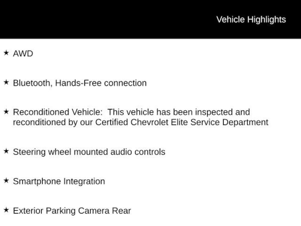 AWD, Bluetooth, Hands-Free connection, Reconditioned Vehicle: This vehicle has been inspected and reconditioned by our Certified Chevrolet Elite Service Department, Exterior Parking Camera Rear, Smartphone Integration, Steering wheel mounted audio controls.Odometer is 5706 miles below market average! 25/32 City/Highway MPGTax, title, license and $249.00 document preparation fee are extra. We make every reasonable effort possible to present information and pricing that is true and accurate. Some information provided may come from third party sources. To ensure your complete satisfaction, please verify the accuracy prior to your purchase. It is the responsibility of the consumer to verify the accuracy of information listed.Awards:* ALG Residual Value Awards, Residual Value Awards * 2019 KBB.com 10 Most Comfortable Cars Under $30,000 * 2019 KBB.com Best Resale Value Awards * 2019 KBB.com 10 Best All-Wheel-Drive Vehicles Under $30,000 * 2019 KBB.com 5-Year Cost to Own Awards * 2019 KBB.com Brand Image Awards